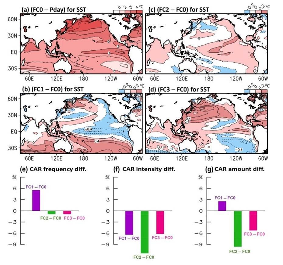 然而,比較四組海溫情境的推估情形,夏季午後對流降雨事件的變化幅度,卻存在很大差異(圖1e-g)。當東太平洋海溫偏冷(類似反聖嬰)時,午後對流事件發生頻率,會高於其他情境;反之,當東太平洋海溫偏暖(類似聖嬰現象),午後對流的發生頻率與強度則都會下降。這樣的結果顯示,聖嬰現象的週期性變化,將在未來扮演調節臺灣午後降雨的關鍵角色。