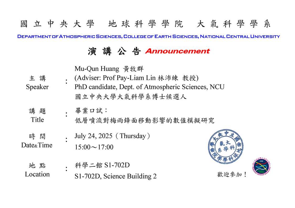 畢業口試: 低層噴流對梅雨鋒面移動影響的數值模擬研究